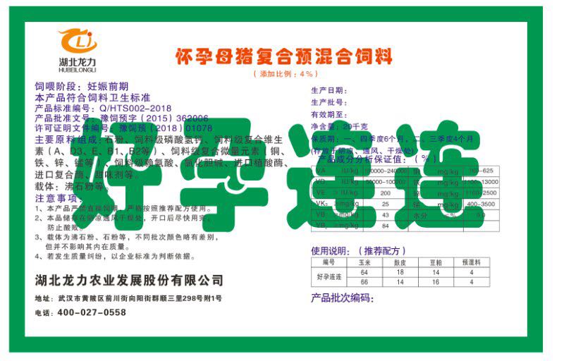 湖北龍力農(nóng)業(yè)發(fā)展股份有限公司坐落于武漢市黃陂區(qū)前川街向陽街群順三里298號附1號。公司成立于2014年6月,公司自成立以來把“創(chuàng)全球最大養(yǎng)豬綜合服務(wù)”為企業(yè)愿景。致力于打造教保料品牌”作為公司發(fā)展的明確目標。公司一直致力于豬營養(yǎng)的研究和開發(fā),積極與國內(nèi)外高校和科研機構(gòu)合作,推廣養(yǎng)豬技術(shù)、動物營養(yǎng)新概念,向世界農(nóng)牧企業(yè)學習與合作。公司采用國內(nèi)先進的生產(chǎn)工藝,選擇高精度電子配料秤,高均勻度、無殘留混合機等先進設(shè)備....